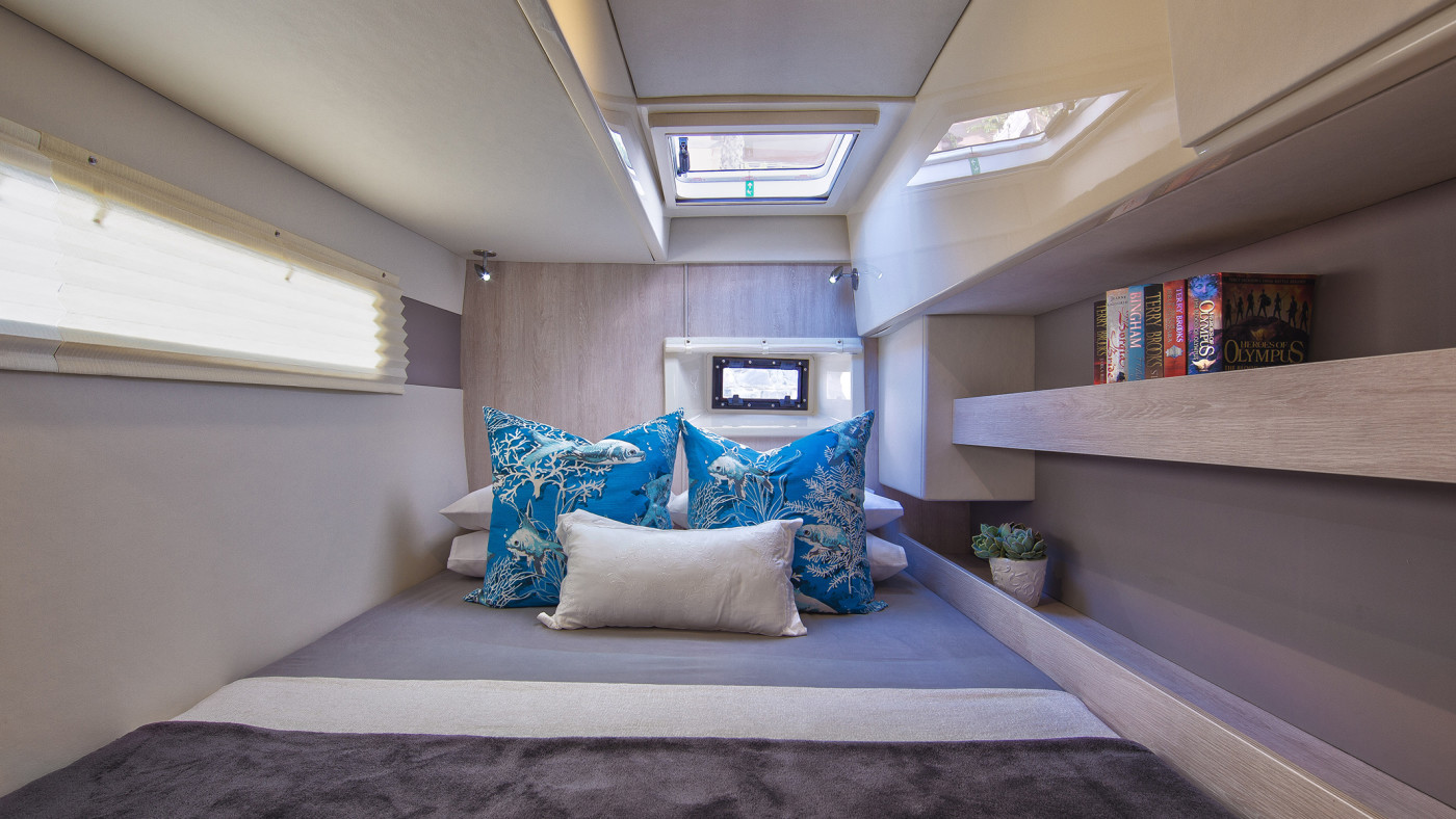 Forepeaks This yacht has two forepeaks accessible through the forward cabins. They are not separated from the forward cabins, are very small and are only suitable for a small child or extra storage. They are not recommended as berths for your charter and are not included in the maximum capacity of your yacht.