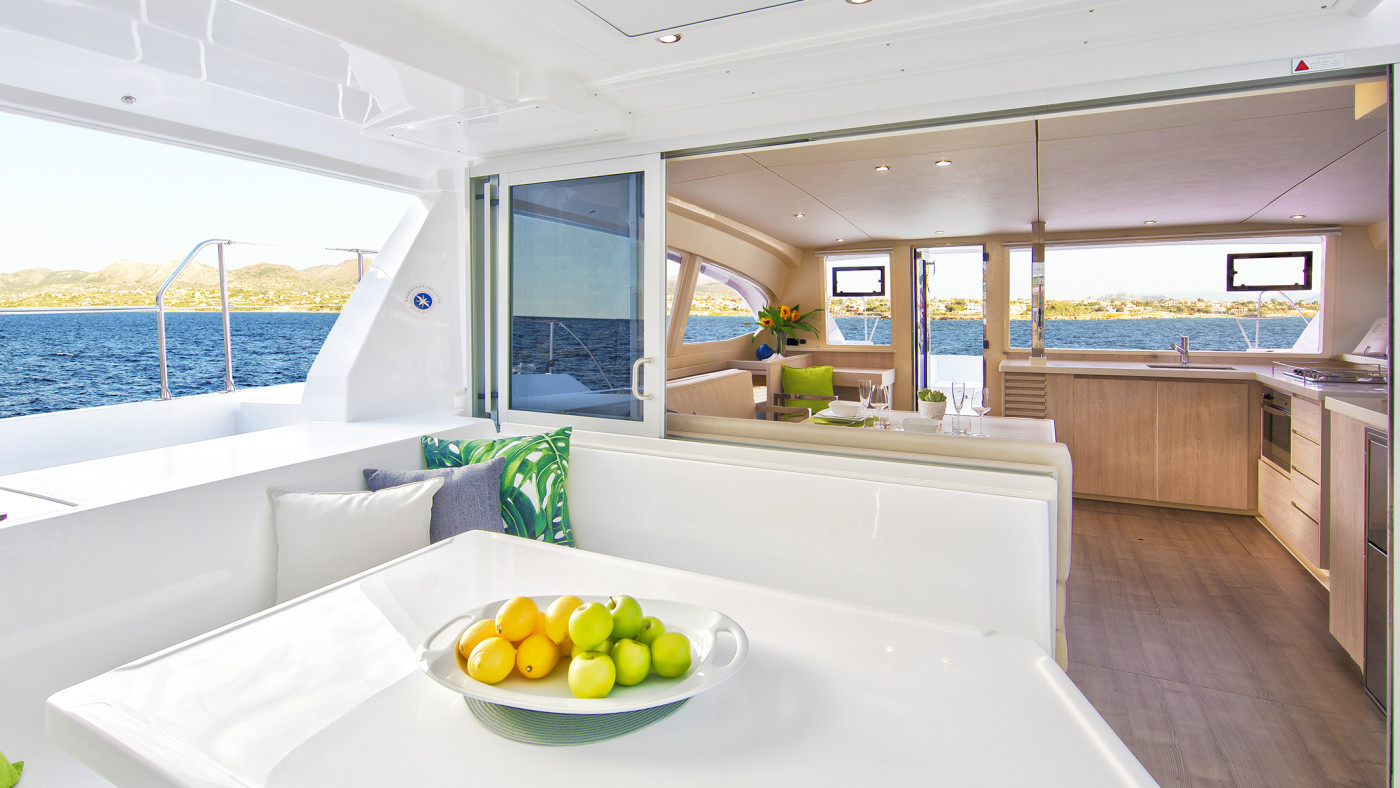 The 4000 features a spacious three-cabin layout. An owner’s suite fills the entire starboard hull with ample storage, counter space, a double bed, and a full private bathroom. Two additional cabins, each with double beds, share a full bathroom in the port hull.