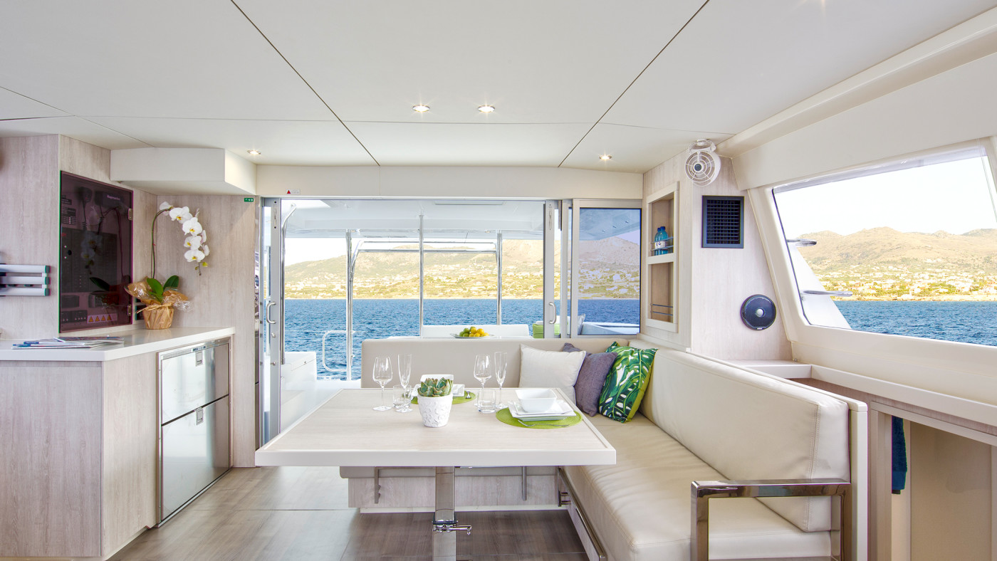 The fully appointed galley is located forward to a spacious settee located aft. Oversized sliding glass doors open to the aft cockpit providing panoramic views from the interior and the best of indoor/outdoor living. With this newly adjacent indoor and outdoor seating, the 4000 layout will provide increased ventilation throughout and ample seating, creating an enhanced social ambiance for your entire crew.