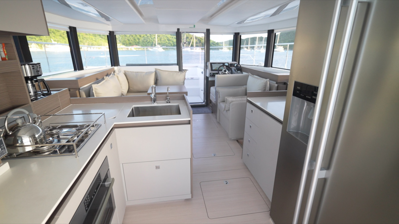 L’intérieur respire le confort et la qualité, avec une cuisine en L entièrement équipée et trois cabines, qui offrent un aménagement spacieux pour les passagers.