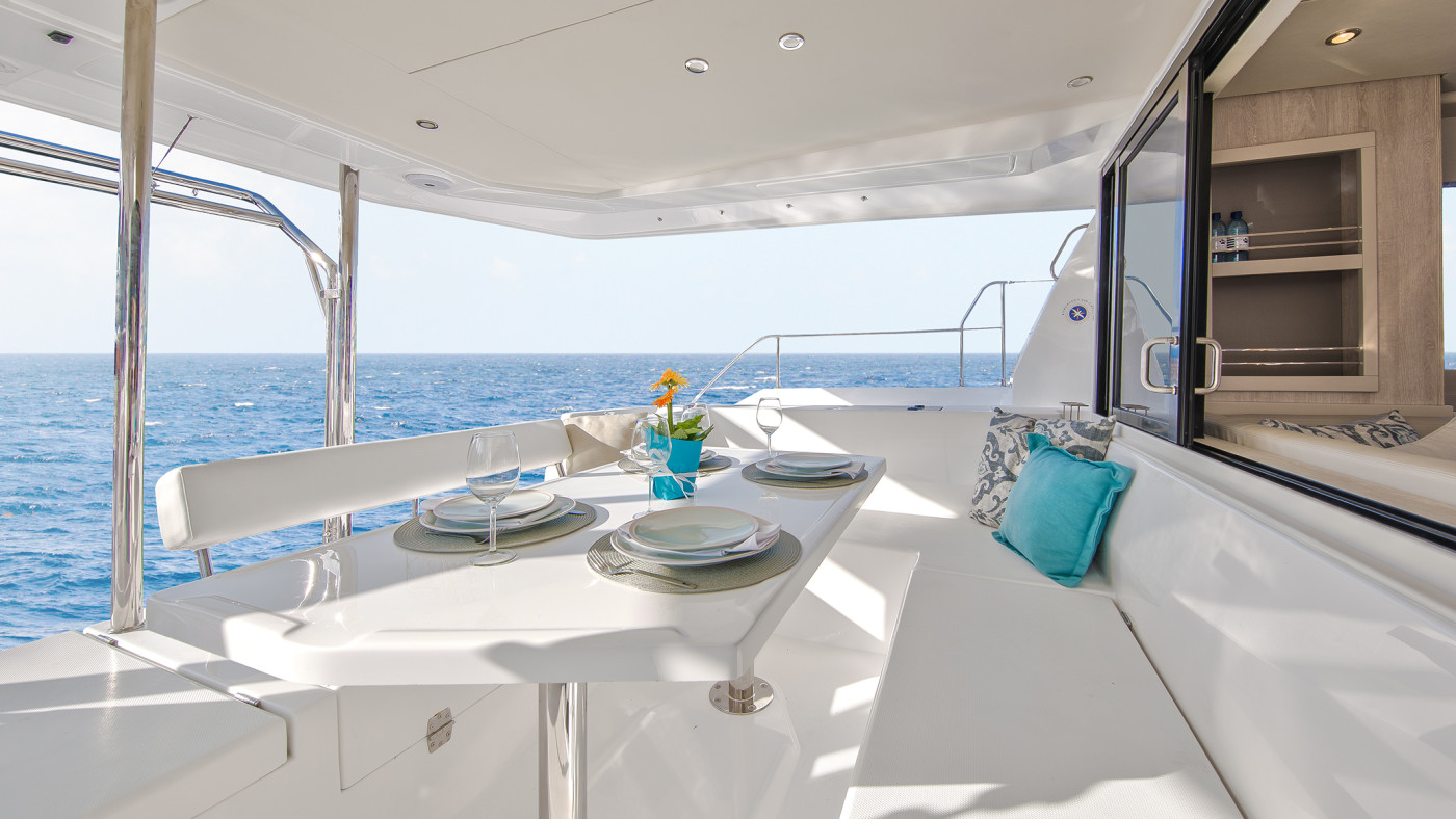 With more interior volume than its predecessor, The Moorings 393PC, this new yacht features a generous indoor living space complete with air conditioning and a fresh, modern look throughout. A well-appointed galley sits forward in the saloon while a forward-facing settee and table are now located aft. Behind the settee, large sliding glass doors open to the aft cockpit, providing panoramic views and an open layout that makes communication between guests an absolute breeze. An additional access door opens to the foredeck, allowing for increased ventilation throughout the yacht.