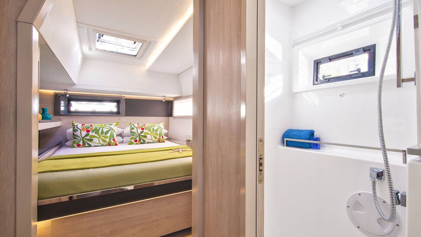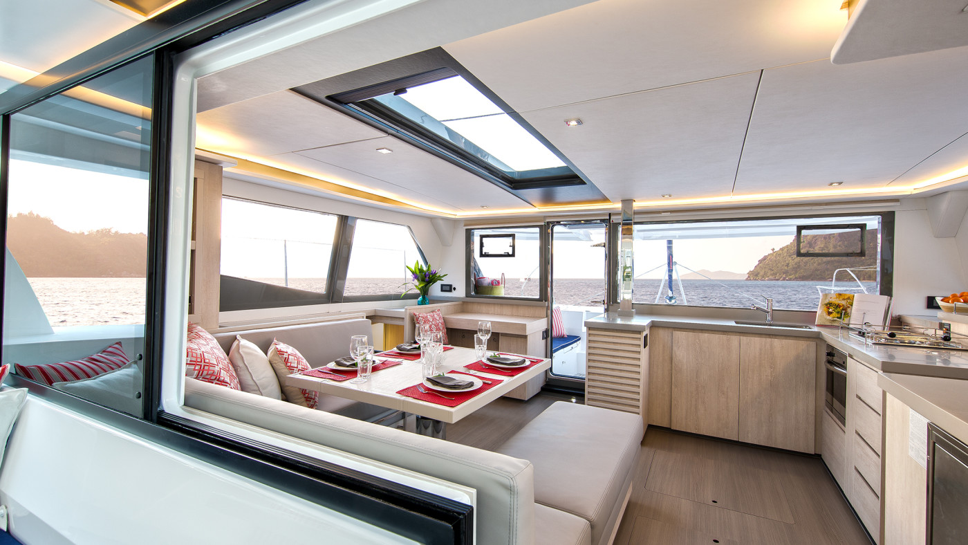 To allow for maximum natural light, the Moorings 4500L boasts expansive windows and an overhead skylight. The saloon flows easily to outdoor spaces with an extended sliding door to the large, cushioned aft cockpit. Blue underwater lights offer the perfect amount of evening elegance and the onboard water maker is especially convenient for the modern charter guest. The elevated lounge with wraparound seating and sunbed is perfect for enjoying 360-degree views.