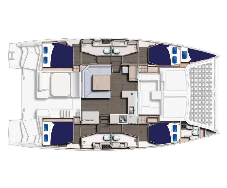 To allow for maximum natural light, the Moorings 4500L boasts expansive windows and an overhead skylight. The saloon flows easily to outdoor spaces with an extended sliding door to the large, cushioned aft cockpit. Blue underwater lights offer the perfect amount of evening elegance and the onboard water maker is especially convenient for the modern charter guest. The elevated lounge with wraparound seating and sunbed is perfect for enjoying 360-degree views.