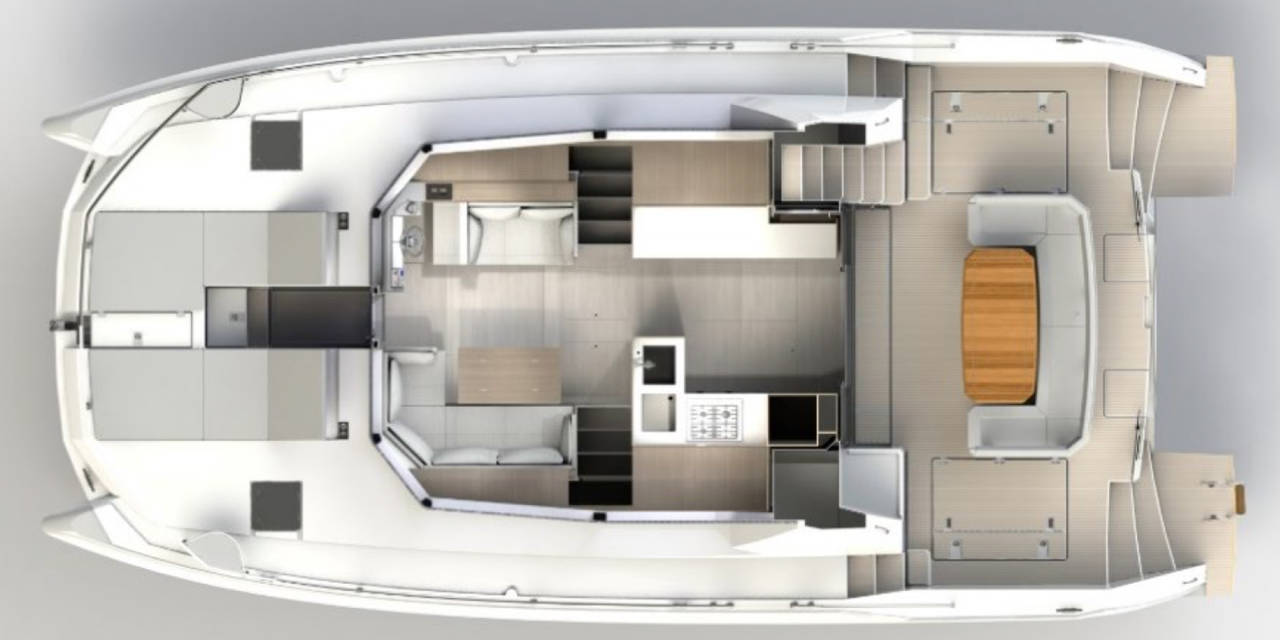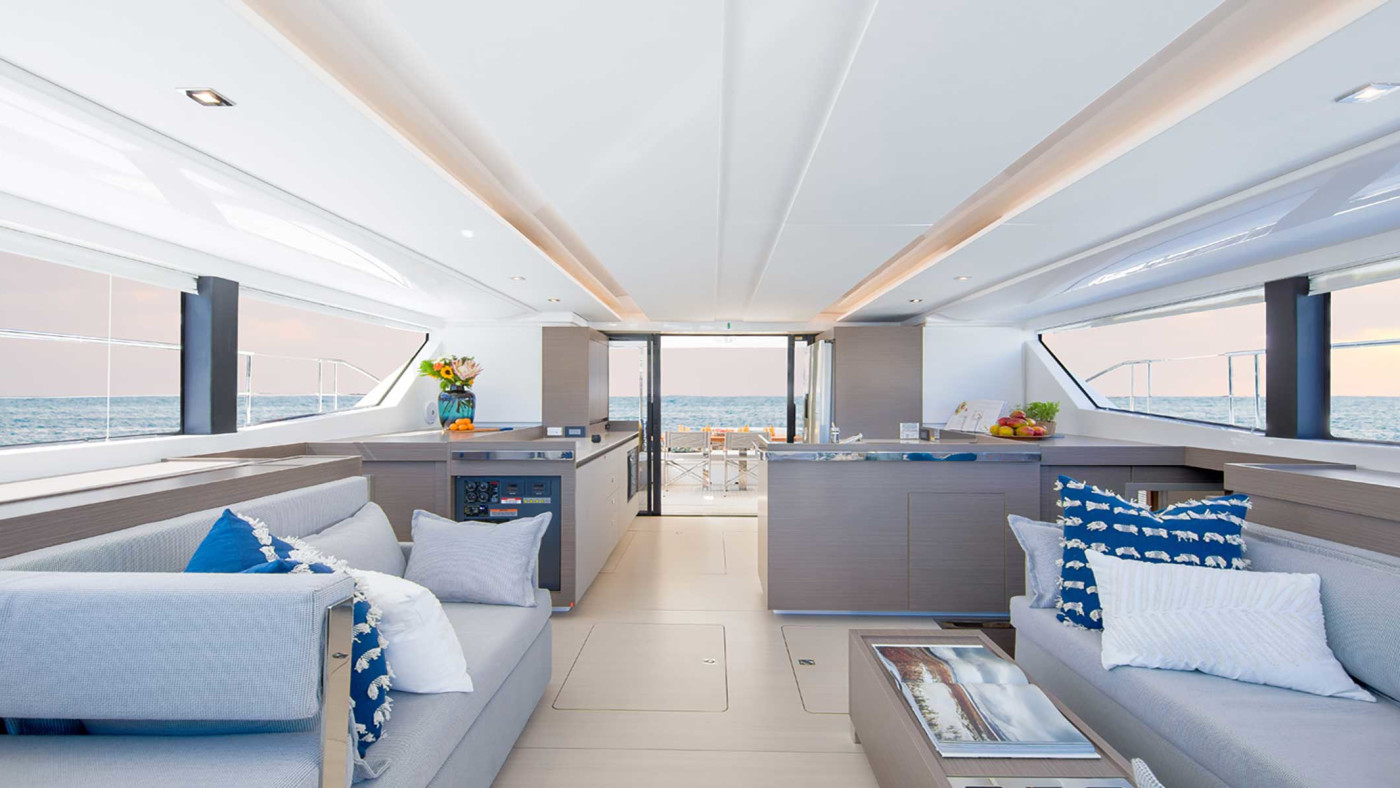 The unique interior finishes and styling are the work of a collaboration between Robertson & Caine’s design team and Ali Beetge of Lijn Architectural Interiors. Cabins feature privacy blinds, large open shelves, and full-length mirrors. The fully-equipped saloon provides a mix of privacy and enough room to gather family and friends. The galley features a 4-burner stove, dishwasher, Staron worktop surfaces, and a variety of storage options.