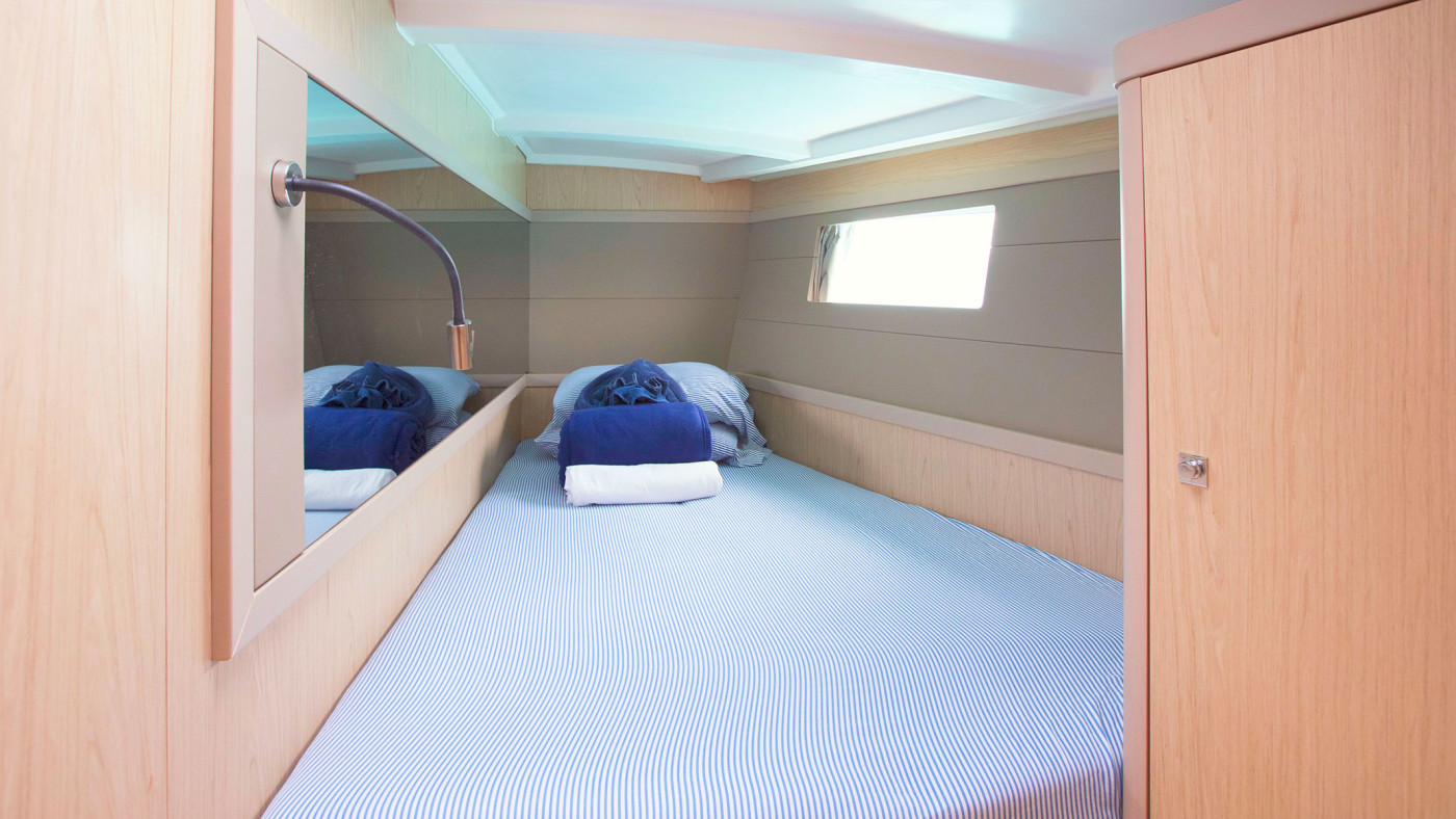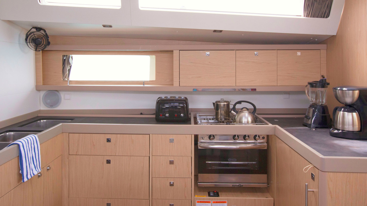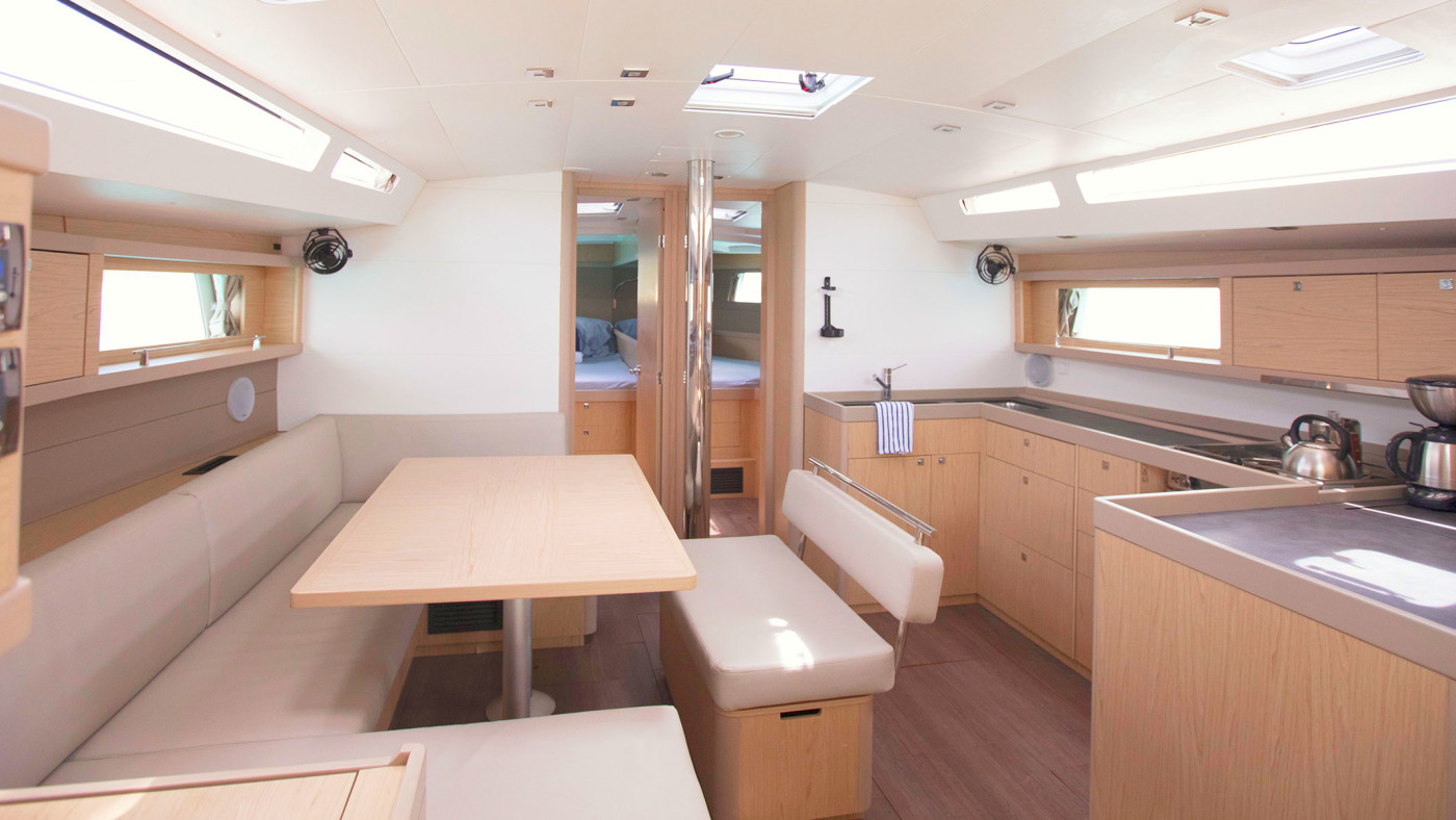 Inside, large portholes illuminate the 48.4’s air-conditioned interior. The saloon includes a u-shaped settee around a convertible drop-down table; flat-screen TV and a well-appointed galley with everything you need for dining at sea—from a two burner gas cooker to a refrigerator, sink, and storage for included cookware. Light taupe cushions are complimented by contemporary oak-colored woodwork amplifying the ambiance of this stylish yacht.
