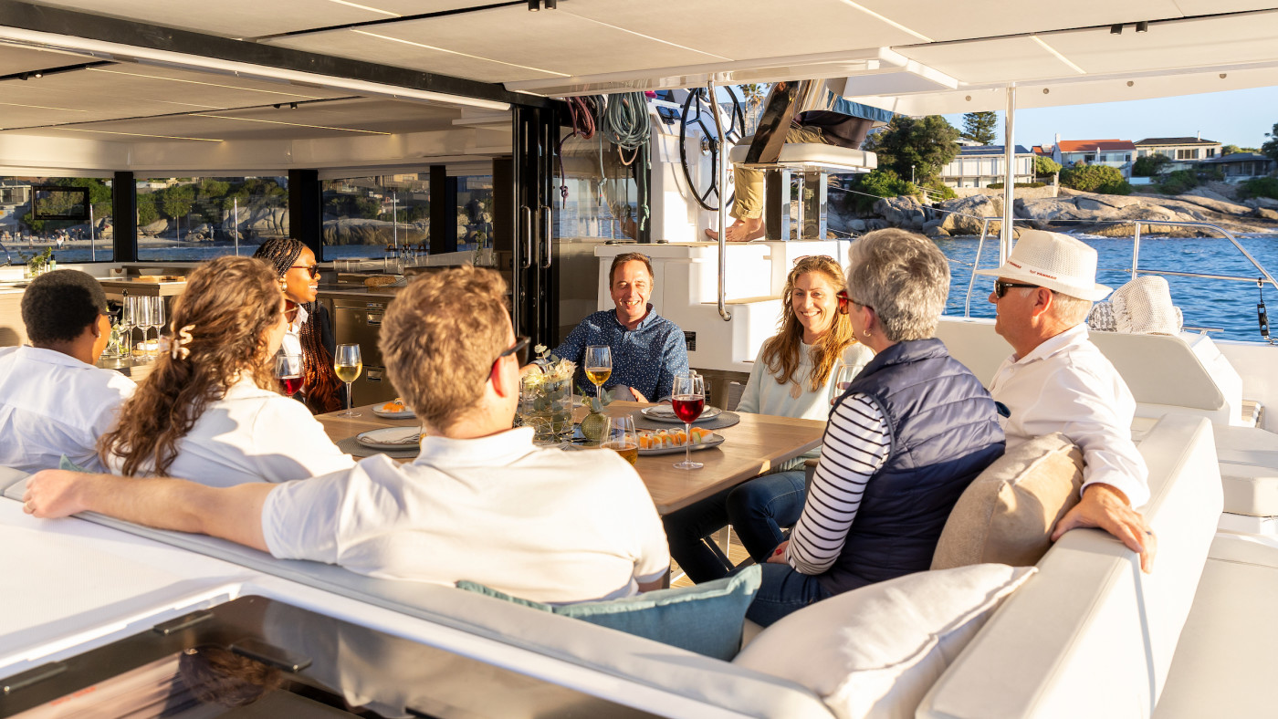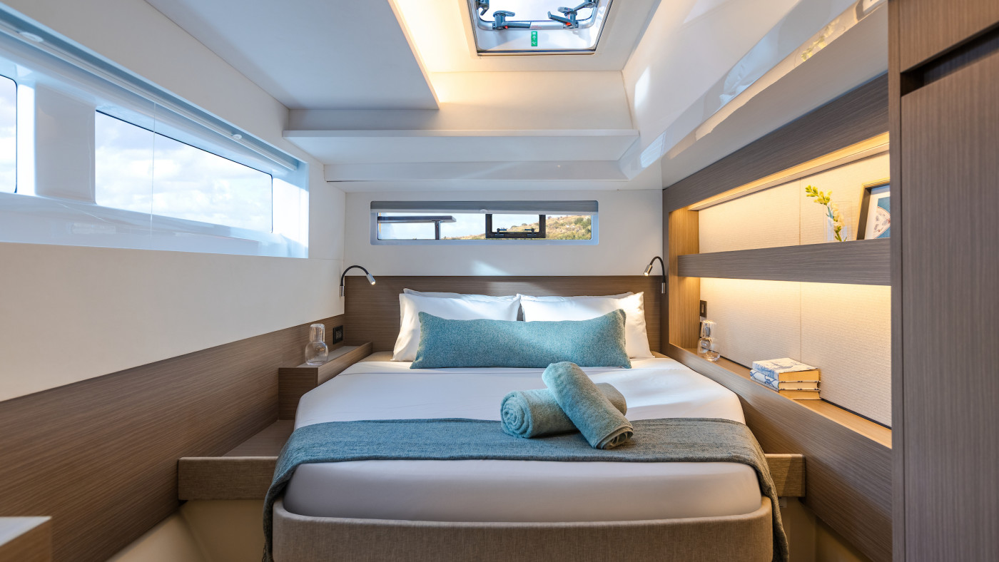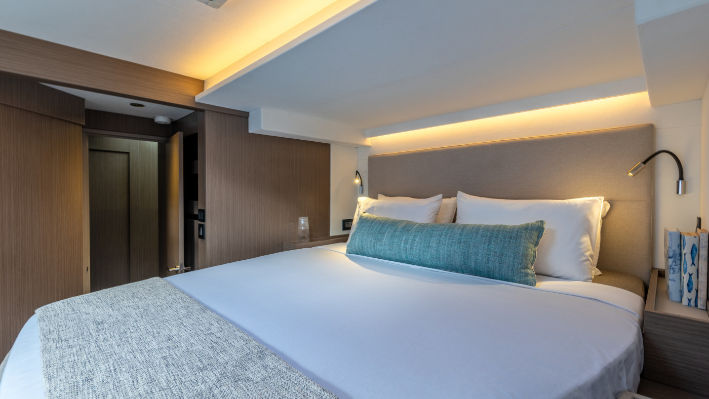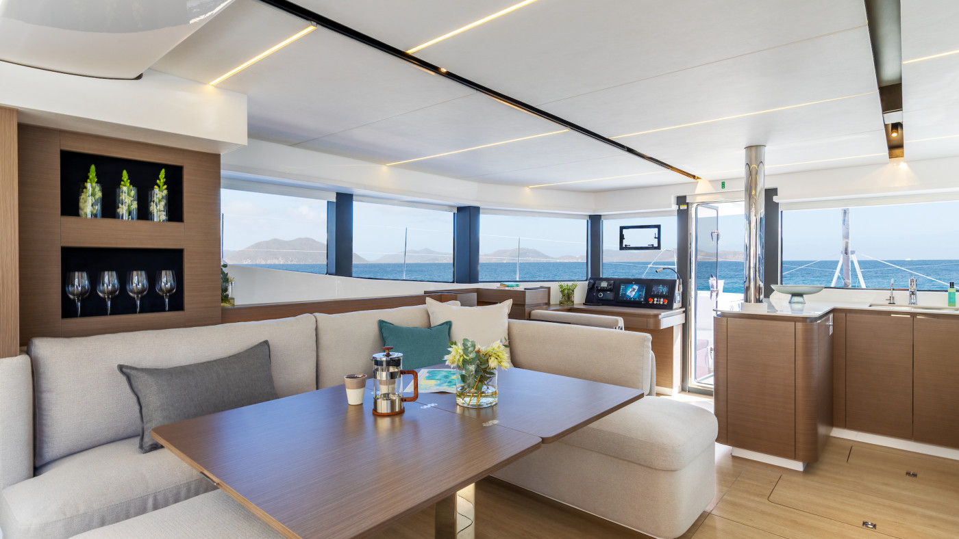 Forward, guests can enjoy a quiet retreat in the forward cockpit with sunbeds, while the coachroof lounge near the helm offers elevated views and yet another relaxing space under way or at anchor.