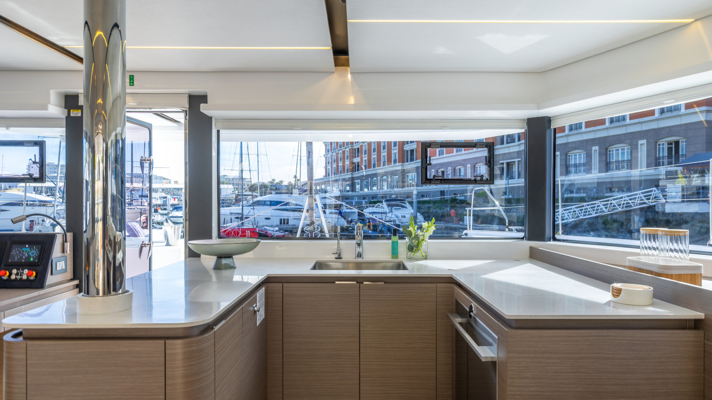 The Moorings 5200 boasts an impressive 438 sq ft of integrated living space, connecting the panoramic saloon to the spacious aft cockpit via wide, sliding glass doors. The result is a light-filled, open-concept layout perfect for entertaining or relaxing.