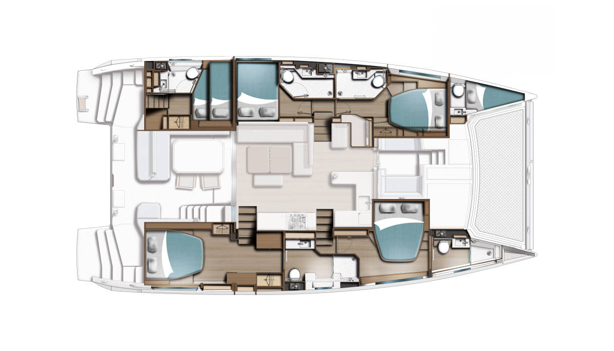 This thoughtfully designed 5-cabin layout accommodates up to 10 guests, making it ideal for large groups, families, or mixed charters. Four spacious double cabins with en-suite heads and separate showers provide private sanctuaries for couples or adult guests, featuring island or wide berth beds, large hull windows, and ample storage.
